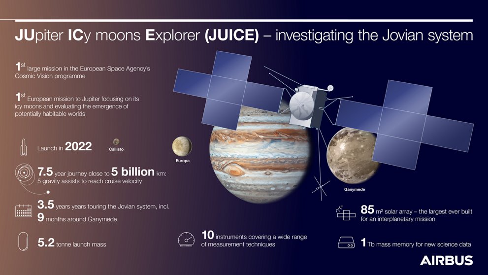 JUICE é a primeira missão de grande porte do programa Cosmic Vision 2015-2025 da ESA. O lançamento deverá ocorrer em 2022 e a chegada a Júpiter está prevista para 2029. A sonda passará pelo menos três anos a fazer observações detalhadas de Júpiter e de três dos seus maiores satélites naturais, Ganimedes, Calisto e Europa.